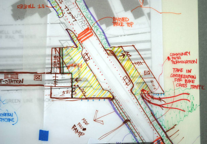 The CCP (Community Corridor Planning) design workshops for the Green Line Stations were terrific. The energy in the room, the breadth of ideas, the creativity of the designs, the attention to critical details, and the keen knowledge of neighborhoods resulted in a terrific community start to making sure the Green Line is designed to serve our community well. We think the experience and the products produced were very exciting for everyone in the room. Keep reading to view example sketches from the all the groups.