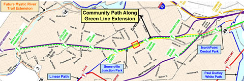 MassDOT created what it calls a “conceptual map” of the Community Path, which is being designed along with the Green Line extension. Click to see a larger version or download the PDF.