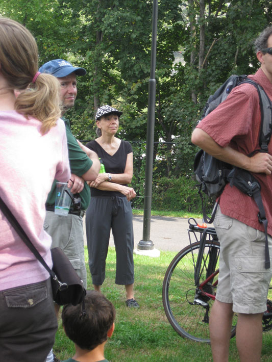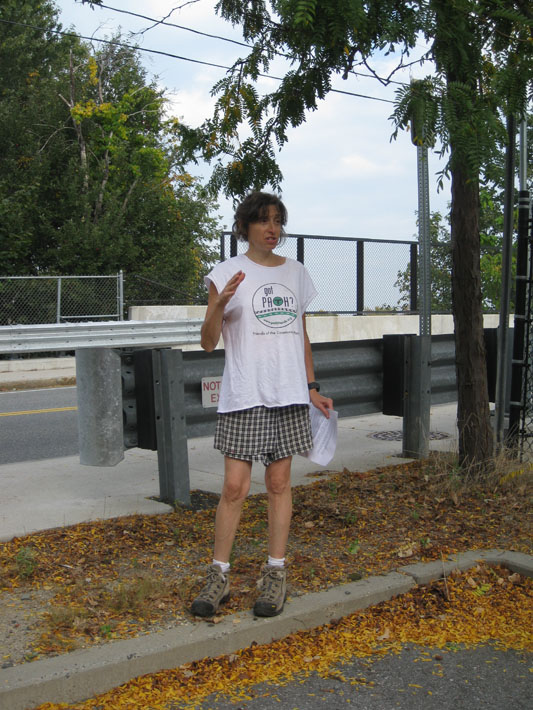Lynn Weissman, co-founder of Fiends of the Community Path, speaking to walk participants at the Lowell St. bridge